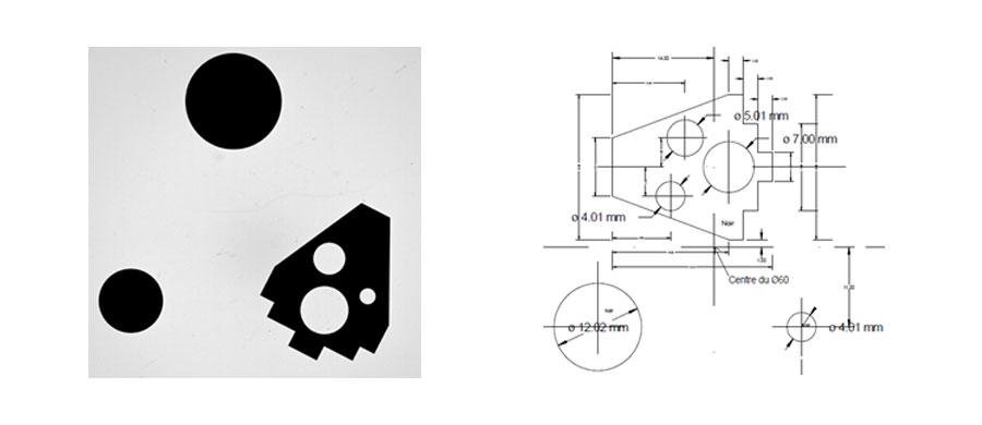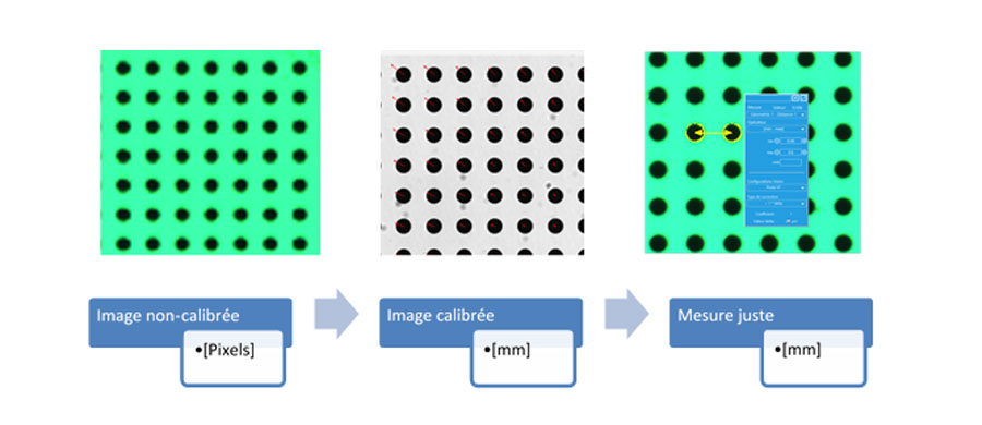 Qualimatest a développé et intégré à ses logiciels un algorithme qui permet, en fonction du système optique (l’ensemble de caméra, objectif et éclairage), de faire une calibration absolue du système. Pour cela, Qualimatest caractérise les composants optiques de ses équipements pour en déterminer la fonction de transfert de la chaîne optique. Les logiciels de la famille QMTMesure corrigent l’image en compensant les imperfections de la chaîne optique pour fournir une mesure « juste ».
