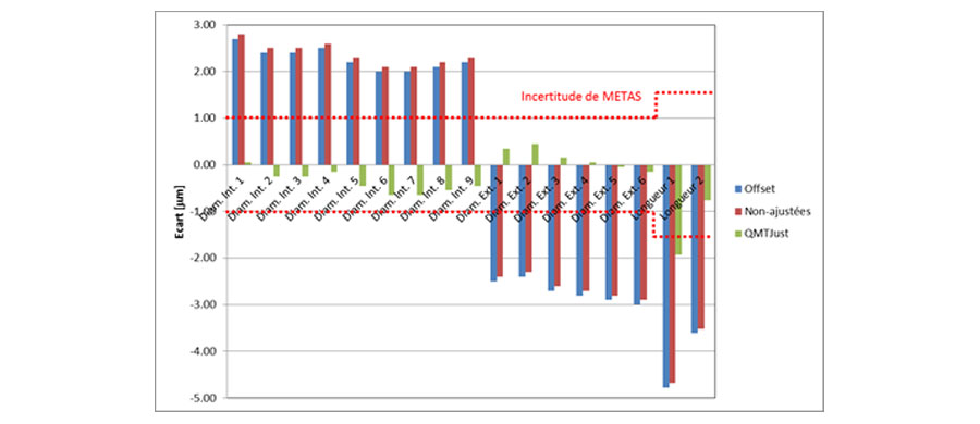 Les incertitudes de mesure rapportées par METAS sont de ±1µm, pour les diamètres, et de ±1.5µm, pour les longueurs. Les mesures corrigées avec QMTJust sont, en moyenne, 16 fois plus justes que celles avec une calibration standard. Dans certain cas, QMTJust a réduit d’un facteur >50 l'erreur de justesse de mesure. C’est, par exemple, le cas du diamètre extérieur numéro 5. L’écart après calibration standard avec METAS est de 2.8µm, mais il est réduit à 0.05µm avec QMTJust.