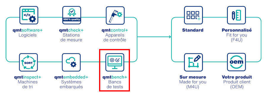 Les expériences cumulées par qmt depuis 1989, ont permis de mutualiser des fonctionnalités communes (« briques ») à plusieurs types de bancs et réutilisables sur différents projets. Cette standardisation permet de garantir la qualité et la fabrication rapide de ces « briques », à des coûts compétitifs. Ces « briques » fonctionnelles font partie intégrante de notre gamme qmtbench.