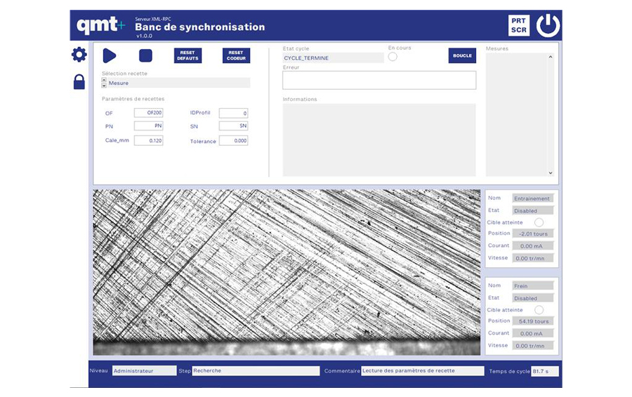 L’installation des composants mécaniques d’entraînement et de mesures est réalisée manuellement par l’opérateur. Une interface tactile permet le déclenchement du cycle quant à lui totalement automatisé.