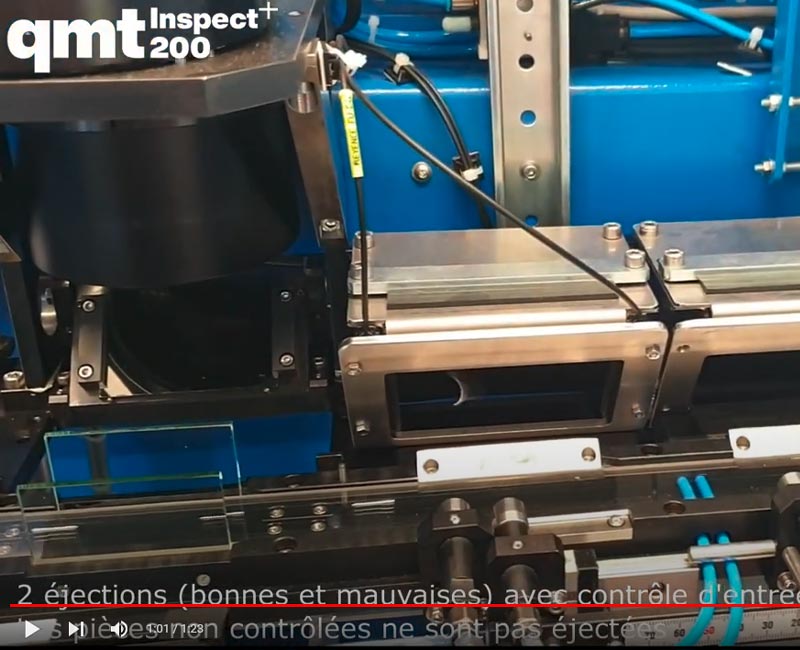 Visualisation du fonctionnement d'une machine qmtinspect-200. Machine de tri à haute cadence, compacte et ergonomique, spécialement dédiée au tri sans contact des pièces cylindriques (axes, connecteurs, goupilles,…)